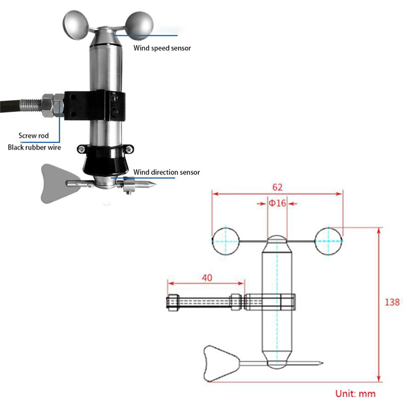 A: It is a two-in-one wind speed and direction sensor made of stainless steel, anti-electromagnetic interference, self-lubricating bearings, low resistance, accurate measurement.