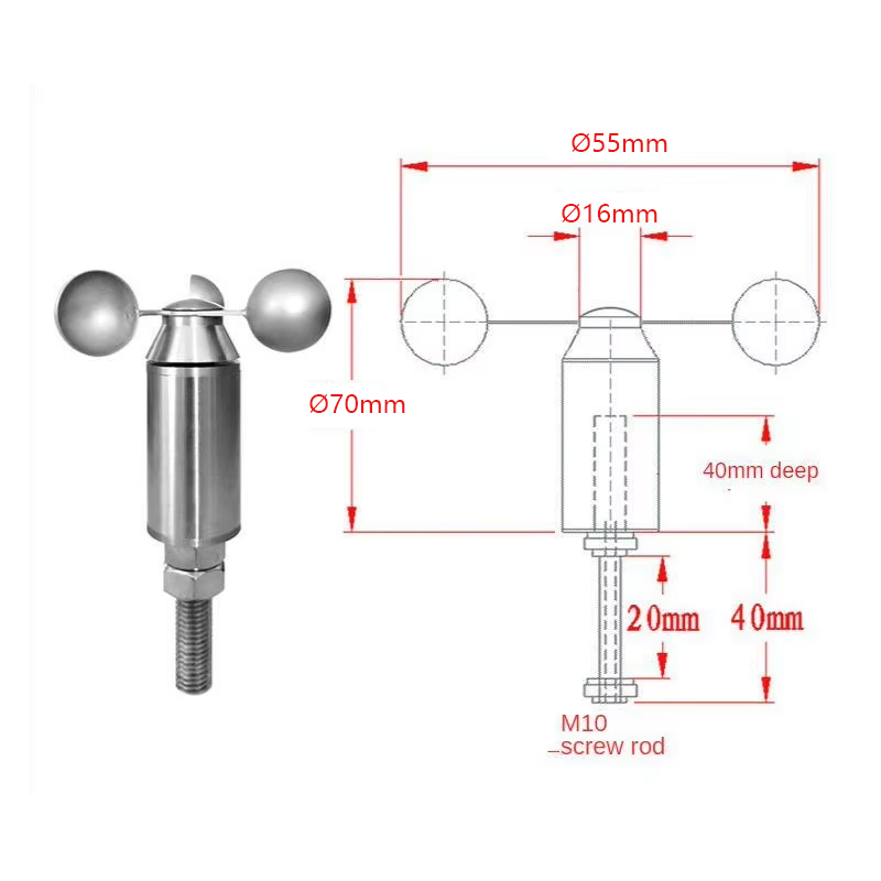 The wind speed sensor consists of a shell, a wind cup and a circuit module. It is small and suitable for measuring wind speed in pipes