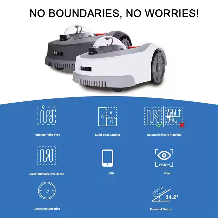 1. Easy to use, create mowing maps, set restricted areas, automatically adjust mowing height (2-9cm), and automatically plan routes.